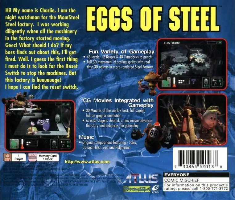 In order to clear a level, Charlie must locate a certain number of time clocks and hit them with his wrench. To reach the clocks, he’ll need to walk across narrow ledges, spinning gears, and past open flames. Besides using the wrench, Charlie can also jump, throw bolts and roll away. Items to look out for are paper airplanes (they’ll give you information or clues), donuts to replenish any damage, coins to give you extra lives and fans to cool you down. After all, moving through a hot steel factory can be especially dangerous to an egg. The game automatically saves your progress to memory card, so keep moving and save that factory!
