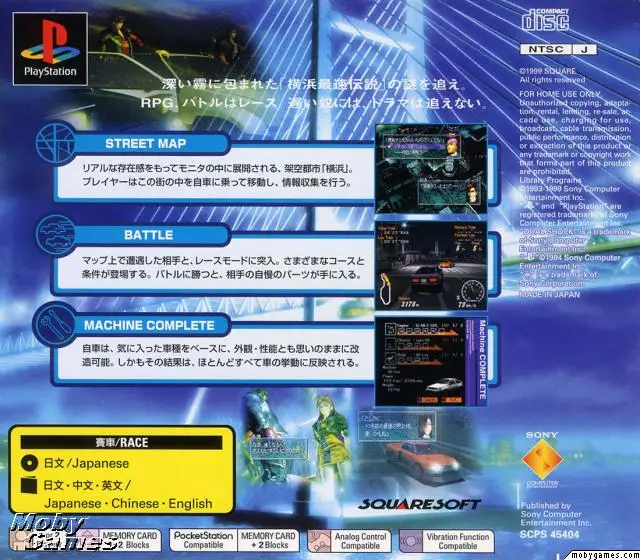 Racing Lagoon is a Racing-RPG. Your earn experience for your various car parts and racing points by challenging other cars on streets modeled after the actual roadmaps of Yokohama, Japan. After winning a race, you’ll get a certain amount of “Reward Points” which you can then use to take a part from your opponent’s car, anything from the engine to the paint scheme. The game is broken up into 10 nights of racing, with main character Sho Akasaki trying to become the king of the underground racing scene.