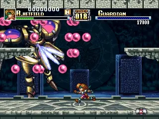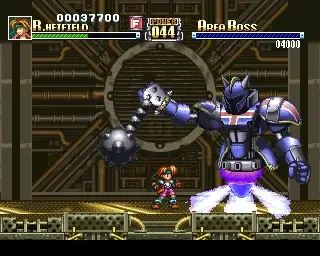 As either Axel or Ruka, blast your way through six side-scrolling levels against hordes of enemies, facing off against several bosses in each level. You can select from four different weapon effects (normal, bouncing, homing and flamethrower), use smartbombs and a grappling hook.