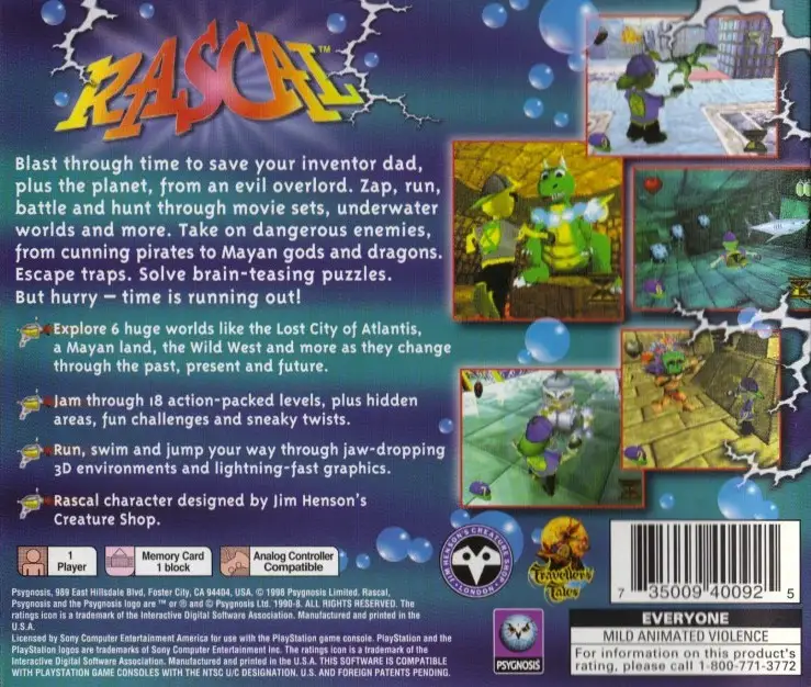 Armed with the one-of-a-kind Bubble Gun, Rascal will travel through time to thwart the evil minion’s plans and rescue his grandfather. As a third-person 3D platformer, players will traverse through ancient Mayan ruins, Old Western settings, and the Lost City of Atlantis; there are six worlds broken into 18 levels apiece, each crammed with hidden areas and bonus goodies!