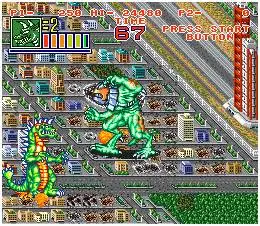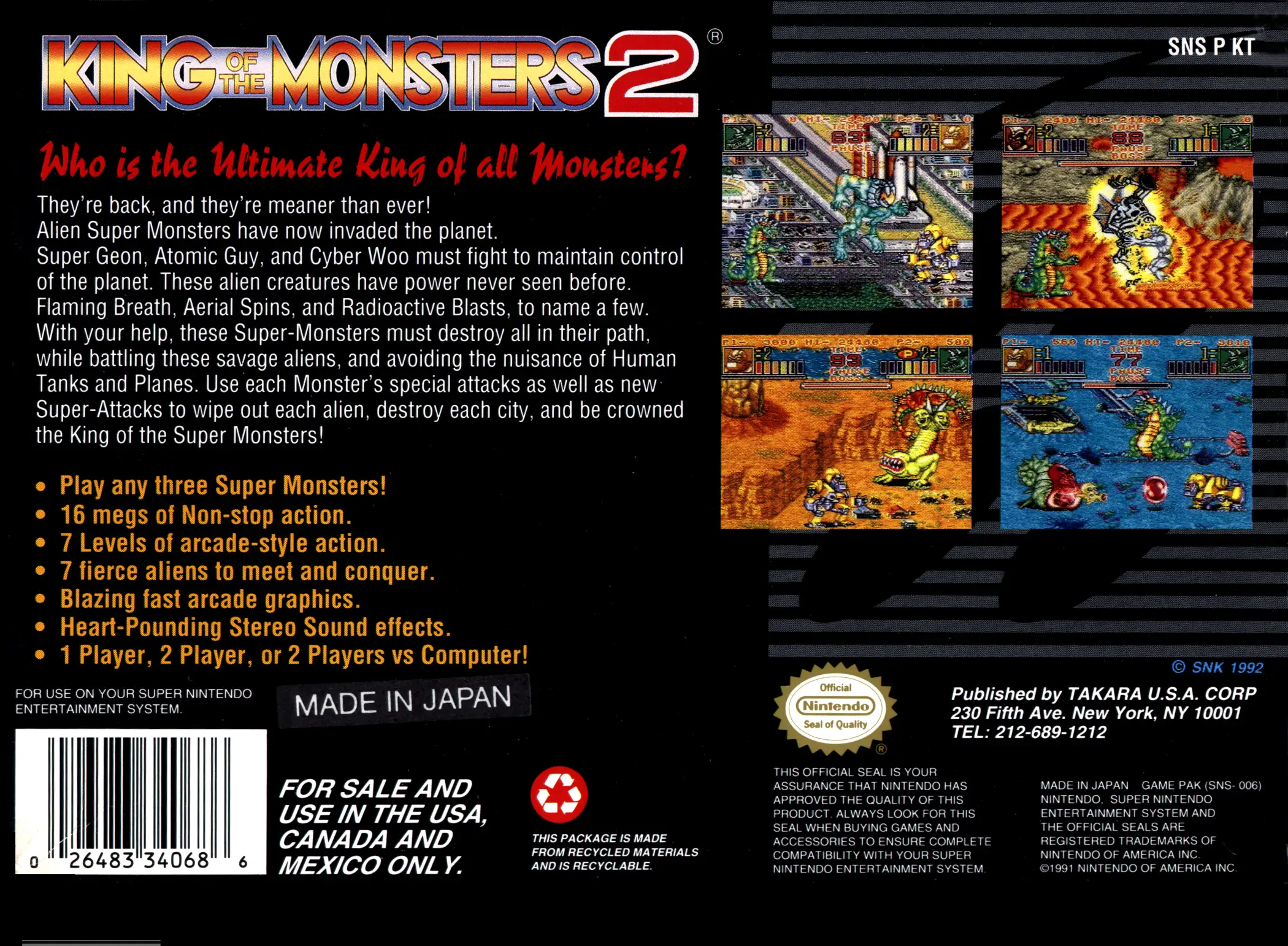 The object of King of the Monsters 2 is similar to its predecessor. Choose from three monsters which include a large lizard, a large robotic ape, and a huge mutant human. Then walk through each city, making sure to destroy everything in site, including planes, buildings, and other creatures. When smashed, some buildings reveal power-ups that make your character more powerful. At the end of each city, you go head-to-head with the boss creature. There are small stages in between where you fight a second monster for bonus points, or you fall from the sky and land underwater where you try to collect points and power-ups while falling.