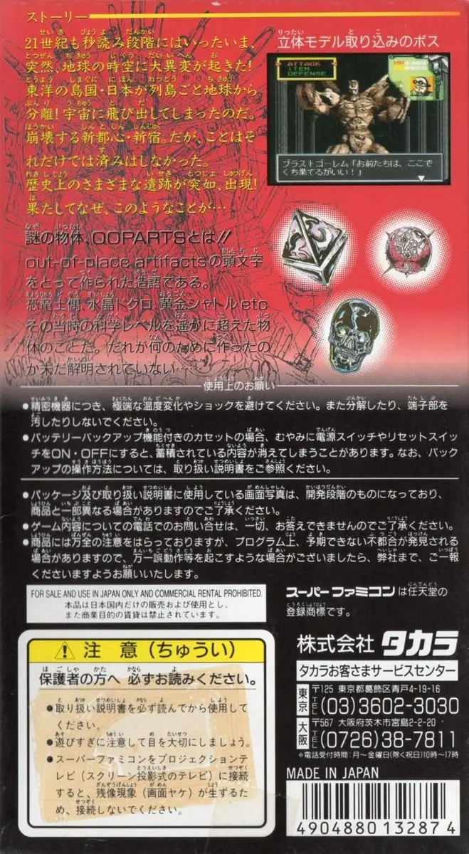 You find yourself in the middle of the Tokyo district Akihabara. But is this really Akihabara? The buildings have turned into ruins, and you wander around the deserted streets without any idea of how you could possibly be in such a place. A strange giant head appears in front of you, and defeats you in battle. When you wake up, you find out that Japan is floating in the air, and is attacked by a mysterious force that spawned countless demons who brought destruction to the cities. People are hiding among rubble and in underground passages. Some of them are fighting the demons, joining an organization called Self-Defense Forces. The hero’s first objective is to find a way to his home district Shinjuku, where he will obtain more information about the power that threatens Japan, and discover mysterious artifacts from an unknown civilization, called ooparts (out-of-place artifacts).