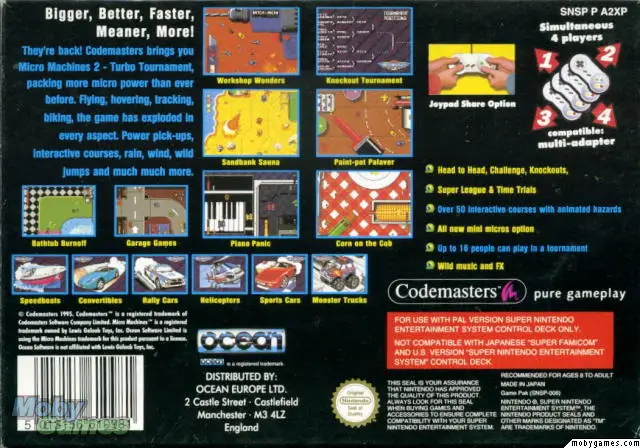 The second game of the Micro Machines series. Like in its predecessor, you behind the steering wheel of an extremely small car. You race around on interesting places, like a table, a treehouse and many more. The control of the cars is sometimes quite difficult, especially if you don’t know the tracks (the top-down view is not very clear). The CD-ROM version additionally features CD-Audio music and a track editor.