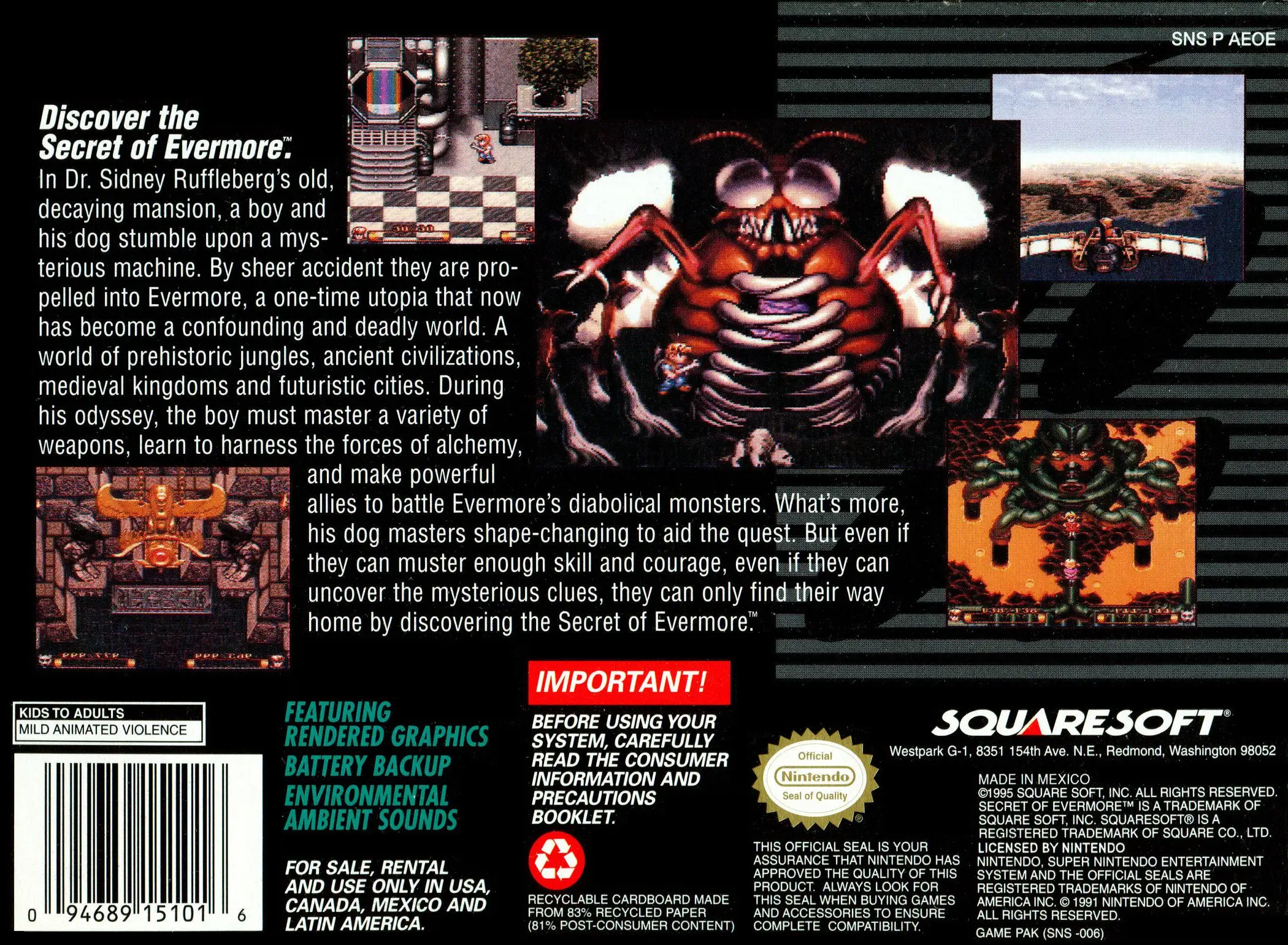 Secret of Evermore is another famous RPG developed and released by Square in 1995. A day at the movies for a young boy & his dog turns into an adventure that spans across several different time periods and locations, on their journey they discover the Secret of Evermore and find their way home. Produced by the North American branch of Square, Evermore’s soundtrack would be the first major work by Jeremy Soule, the famed Elder Scrolls composer.