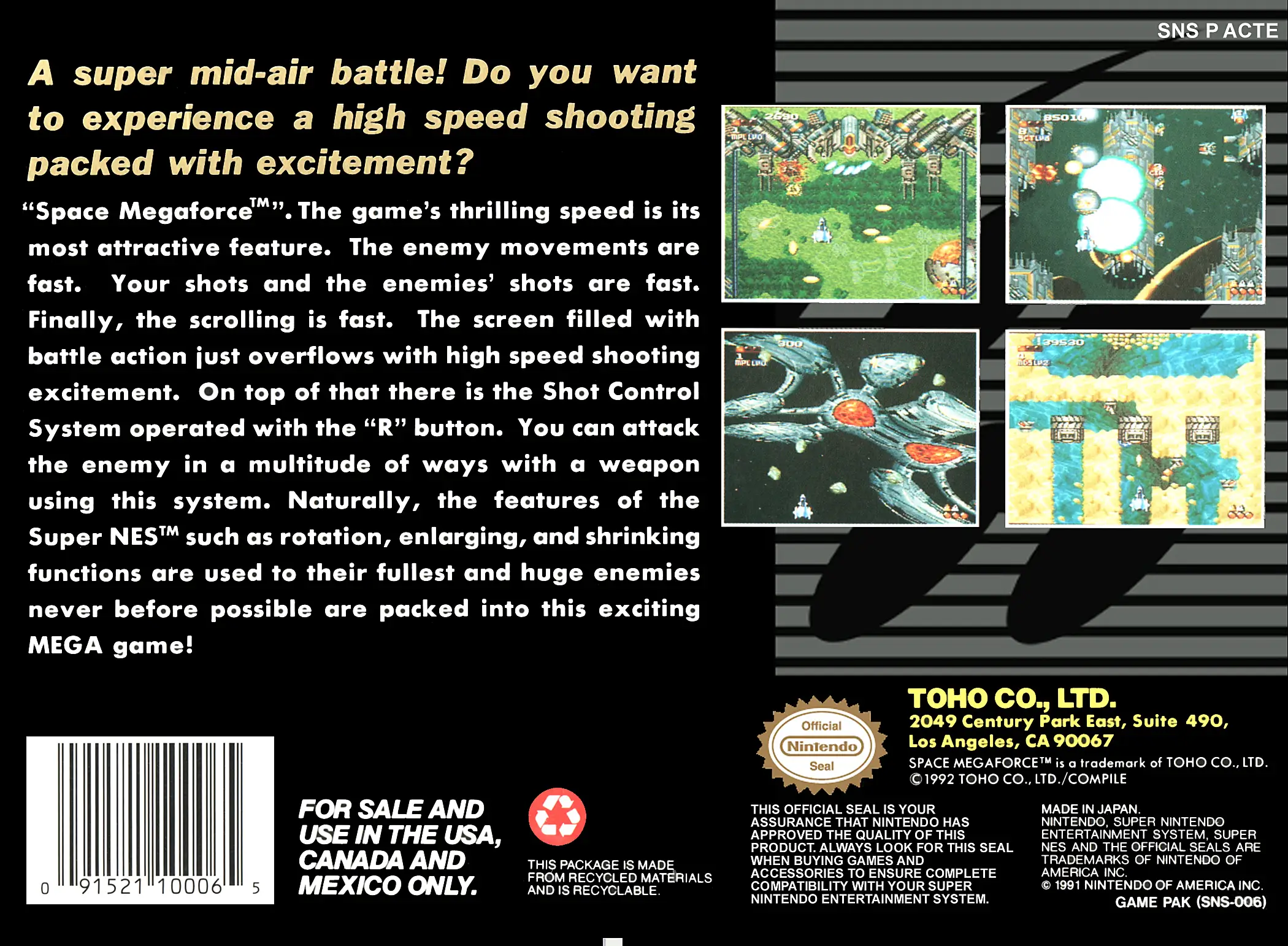 Compile’s Aleste series lands on the SNES with the appropriately named Super Aleste. Taking the role of a lone starfighter pilot, you are tasked with destroying an evil alien armada in standard 2D shooter fashion. And while you may be alone, you certainly won’t be underpowered, with eight different types of weapons, each having six power-up levels for a grand total of 48 firing modes (not counting bomb power-ups) Super Aleste boasts one of the largest arsenals in 2D shooter history.