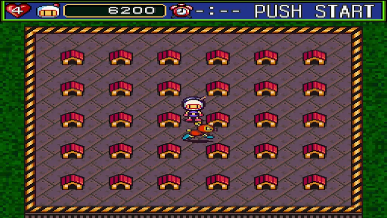 Super Bomberman 4 is an action game in which players lay bombs to destroy enemies or other bombermen. Other than laying bombs, the game includes a number of power-ups, which allows players to increase the range of a bomb's explosion, punch or kick bombs already on the ground, or pick them up and throw them at another player. The explosions of the bombs can harm anyone on the field, including the bombermen who left the bomb in the first place. There are two game modes, Normal Game (the campaign, which can be played with two players), and the Battle Game, which has three separate modes.