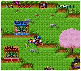 The game has a mix of genres. The chief gameplay is a platformer where the player can leap up and down floors similar to Ninja-Kid or Mr. Goemon. If the player enters a flying gate, they are escorted to a shoot ’em up stage in which they control a flying lobster fighting samurai heads and Maneki Nekos.