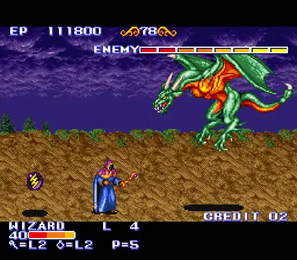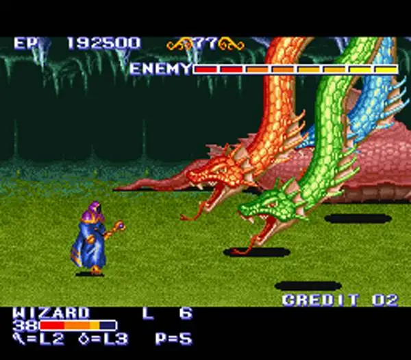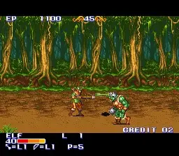 The King of Dragons is a fantasy themed side-scrolling beat’em up. There are five different characters to choose from: a fighter, a cleric, an elf, a wizard and a dwarf. All characters have different strengths and weaknesses in speed, attack power and magic. After choosing an appropriate character, the player has to fight his way through numerous short levels guarded by an equally high number of bosses; gaining better weapons and shields/magic in the process.