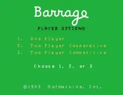 Barrage is a variant of Missile Command where the player has to prevent the fiendish Draks from dropping acid balls on a planet. The player is in command of two laser gun towers located at the side of the screen and moves a crosshair to aim and destroy the small balls as they appear from the top of the screen. On the ground are various military vehicles and buildings that have to be protected.